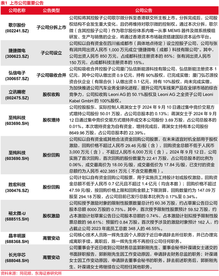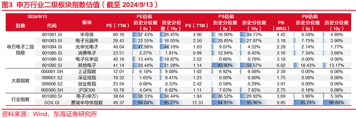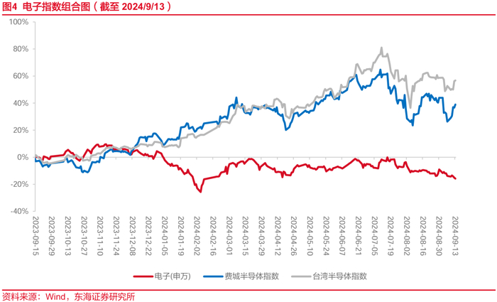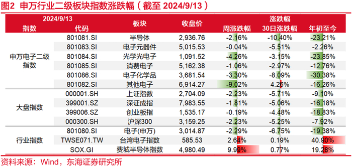 截止9月13日,申万电子二级子板块涨跌:半导体(-2.16%)、电子元器件(-0.04%)、光学光电子(-4.26%)、消费电子(-1.06%)、电子化学品(-3.30%)、其他电子(-9.02%)。海外方面,台湾电子指数上涨2.64%,费城半导体指数上涨9.99%。