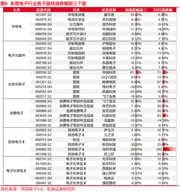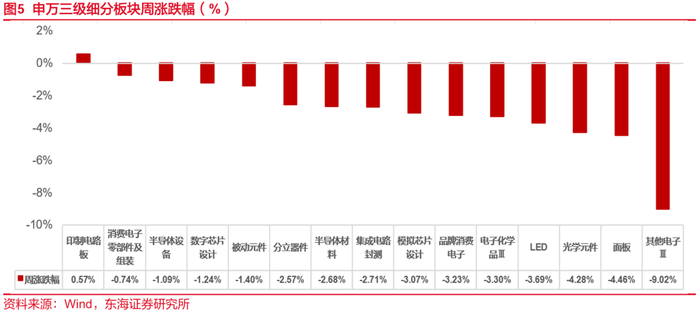 本周半导体细分板块涨跌幅分别为:品牌消费电子(-3.23%)、消费电子零部件及组装(-0.74%)、半导体设备(-1.09%)、面板(-4.46%)、被动元件(-1.40%)、LED(-3.69%)、数字芯片设计(-1.24%)、模拟芯片设计(-3.07%)、印制电路板(+0.57%)、电子化学品Ⅲ(-3.30%)、光学元件(-4.28%)、半导体材料(-2.68%)、其他电子Ⅲ(-9.02%)、集成电路封测(-2.71%)、分立器件(-2.57%)。
