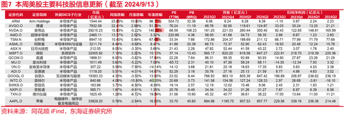 我们选取了较有代表性的部分美股科技股,并将相关信息更新如下。选取的科技股中大部分业绩在2024年第二季度实现了不同程度的环比上涨。本周涨幅居前的为Arm Holdings(+25.65%)、博通(+22.41%)和英伟达(+15.83%)。