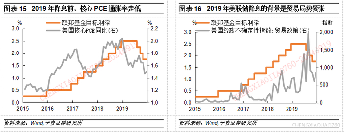 2019年7月31日,美联储宣布降息25BP至2.25%,声明称,美国经济适度增长,就业市场稳健,但整体及核心通胀率均低于2%,除此之外并没有特别强调降息的动机。声明还显示,有两位委员反对降息、支持保持利率不变。NPR报道称,本次降息是一项“保险政策”,旨在防范经济减速,尤其考虑到贸易局势紧张和全球增长放缓的背景;当日市场反应消极、股市下跌,因投资者认为美联储的降息动机不够积极;时任总统特朗普也发推文批评道:“鲍威尔让我们失望了”。10月30日,美联储在第三次降息后,释放暂停降息的信号,部分原因是贸易形势好转,即中美贸易谈判及英国脱欧谈判出现积极进展。