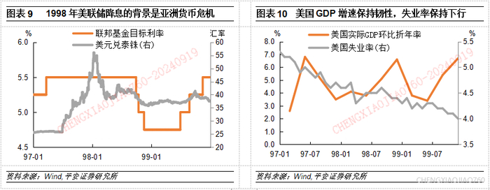 1998年,美联储降息的背景是,经济保持一定韧性,但外部环境动荡,美股出现调整。美国实际GDP环比折年率在上半年保持3.8-4.1%的较高水平,失业率在1998年下半年仍保持4.5%左右较低水平,不过制造业PMI在6月跌入萎缩区间;PCE通胀率自1997年开始由2%缓慢下行,1998年2月以后低于1%。1997年下半年,泰国放弃固定汇率一举引发“亚洲金融危机”,1998年亚洲外汇和金融市场持续动荡,1998年9月俄罗斯金融市场也受到波及,这场危机直到1999年才基本结束。1998年7-8月,标普500指数出现近两个月的调整,最深跌幅接近20%。美联储1998年9月的会议声明中写道,“降息行动是为了缓解外国经济日益疲软以及国内金融环境不够宽松对美国经济前景的负面影响”。