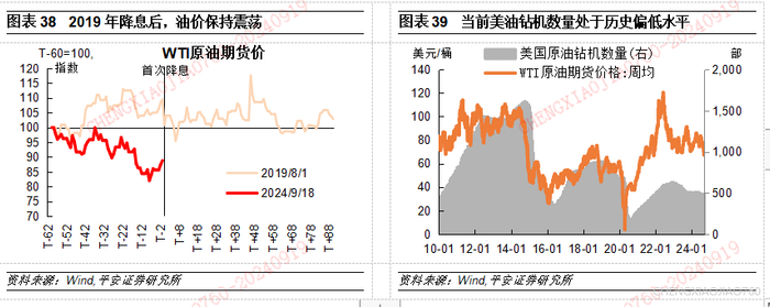 原油价格较可能在降息后保持震荡。历次降息后,由于经济仍在走弱,油价下跌的概率较大。但需注意,2010年美国页岩油革命以后,美国原油的产量上升且油企业也能更加灵活地调控产量,国际油价的定价与需求的相关性减弱。页岩油革命后,仅有一轮降息周期,即2019年,彼时WTI油价在降息前后保持震荡,并未明显下行。本轮降息前,油价在需求担忧中已经出现一定调整,限制了进一步下行的空间。展望后市,需求担忧对油价的冲击可能减弱,如果美国油企或欧佩克+等产油国适当减产,油价较有可能保持在近期水平震荡。