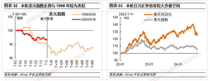 美元指数未必因降息而下跌,但可能受日元升值拖累。本轮降息前,由于日本加息等因素,美元指数下行节奏较快,这一情形比较类似1998年,即美元指数的走势相对更受到外部环境的影响。展望后市,美元走势存在不确定性。如果日本央行对加息保持克制,那么美元有可能企稳甚至反弹;但如果日本央行继续加息,美元指数也可能处于类似1998年下行的“惯性”之中。我们倾向认为,未来1-2个季度日本央行可能在加息问题上比较谨慎,以管控日元快速升值对日本乃至全球金融市场的冲击;但日本货币政策正常化的方向不改,日元仍有较大升值空间,美元指数仍可能逐渐面临日元升值的拖累。