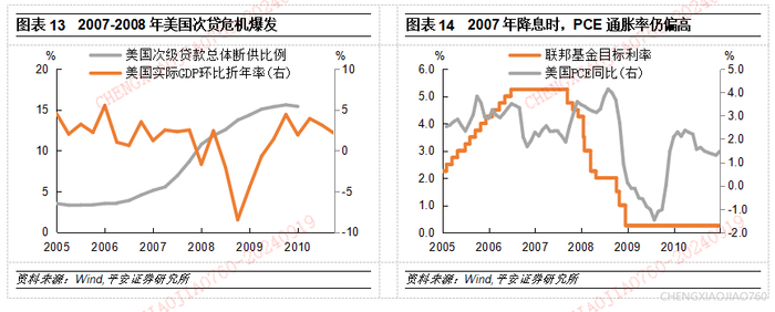 2007年,美国次贷危机逐渐发酵,8月法巴银行“暴雷”影响较大,成为本轮危机开始的关键节点。8月17日,美联储宣布下调贴现率50BP至5.75%,但并未下调联邦基金目标利率;市场反应积极、股市上涨,多数投资者认为“形势可控”;市场预计美联储将于9月降息25BP,相对激进的预期是年内降息3次、每次25BP,也有批评者担忧降息会助长通胀。9月18日,美联储下调联邦基金目标利率50BP至4.75%,声明称,金融市场的发展增加了经济前景的不确定性,信贷条件收紧可能加剧地产调整,今天的行动旨在防止金融市场混乱并促进长期温和增长。此外,声明也指出一些通胀风险仍然存在,美联储将对此密切关注。