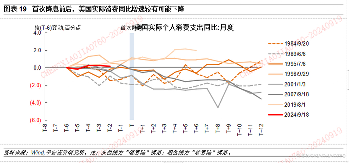 在“硬着陆”和“软着陆”两类情形下,制造业PMI走势均出现走弱,没有呈现明显区别;但实际私人消费增速的变化区别较大,在3次“硬着陆”中均出现明显下行,在4次“软着陆”中可能上行,或阶段下行后于降息一年内反弹。