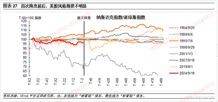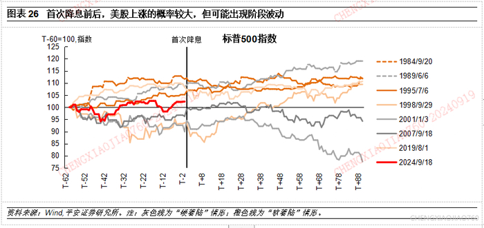 美股涨势可能在首次降息前后阶段“熄火”,但降息2-3个月后通常恢复上涨。在7轮周期中,首次降息前后,美股(标普500指数)在全部4次“软着陆”和1次“硬着陆”情形中保持了上涨趋势。从节奏上看,在首次降息前后1个月,美股通常出现波动调整,原因可能是,市场对于经济和政策前景的判断出现分歧。但是,除非出现“硬着陆”,美股在首次降息后3个月通常已经恢复上涨,标普500指数较首次降息前一日平均上涨2.8%。