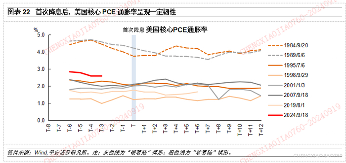 在“硬着陆”和“软着陆”两类情形下,核心PCE走势没有明显区别,均可能呈现韧性;模型通胀预期走势也没有呈现明显区别,在首次降息后都出现了不同程度的下行。此外,通胀绝对水平高低,与是否“软着陆”也不存在明显相关性。