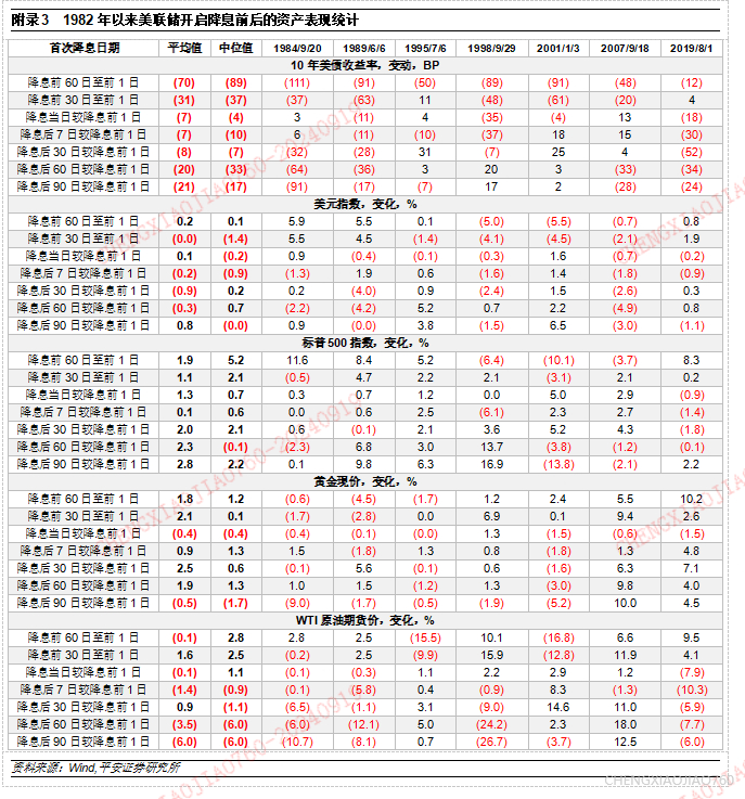 首次降息前后,资产价格如何发展?我们主要统计了7轮周期中,美联储首次降息前60日至后90日期间,主要大类资产价格的变化(详见附录3),可以得到以下结论:
