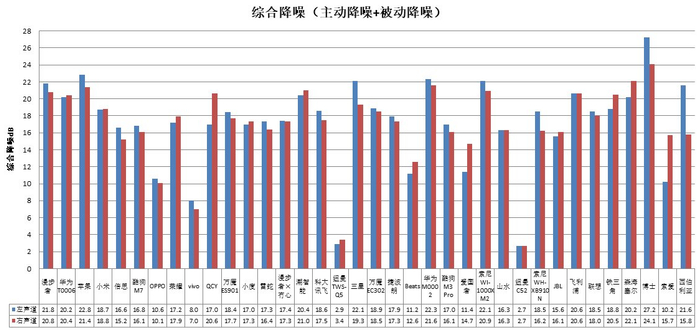 本次综合降噪测试,指的是主动降噪和被动降噪叠加的总体降噪,也是模拟消费者佩戴耳机在日常的噪声环境下最直观的感受。由于参与测试的部分耳机不具备主动降噪功能,所以降噪评价采用综合降噪(主动降噪+被动降噪),综合降噪可以更真实地反映消费者最直观的感受。
