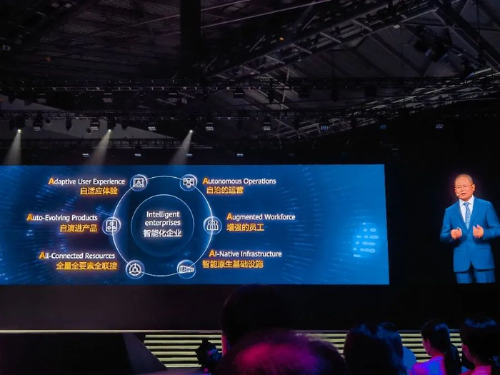 站在全面智能化时代的初期,我们每一个企业,不仅希望今天尽快利用AI创造出价值,同时也希望在未来的智能化竞争中实现领先。这也是我们一直在思考的问题,我想,只有先思考清楚智能化时代企业的未来方向,然后以终为始,来思考今天的战略和行动,是非常重要的。基于这个考虑,结合华为自身的智能化实践、以及华为多年支持各行各业智能化的探索,我想借此机会分享一下我们对智能化时代企业的憧憬,也就是憧憬智能时代的企业大致是什么样子,将会具备哪些特征。
