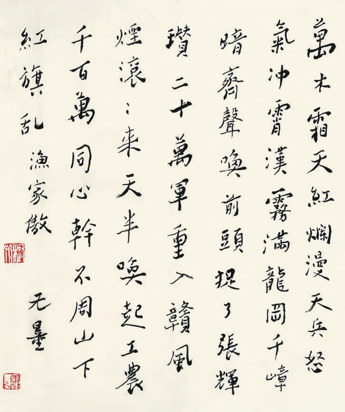 释文:万木霜天红烂漫,天兵怒气冲霄汉。雾满龙冈千嶂暗,齐声唤,前头捉住了张辉瓒。二十万军重入赣,风烟滚滚来天半。唤起工农千百万,同心干,不周山下红旗乱。渔家傲 无量