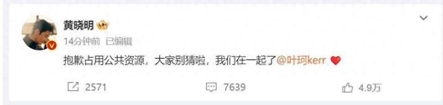 9月19日下午,黄晓明在微博发文承认恋情:“抱歉占用公共资源,大家别猜啦,我们在一起了@叶珂kerr。”