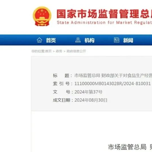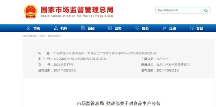 市场监管总局 财政部关于对食品生产经营企业内部举报人举报实施奖励的公告