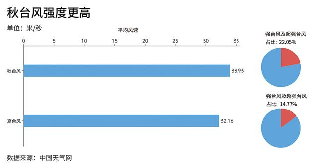 数据上,秋台风平均风速为33.93米每秒,强于夏台风;同时更容易形成强台风及超强台风,占比为22.05%。