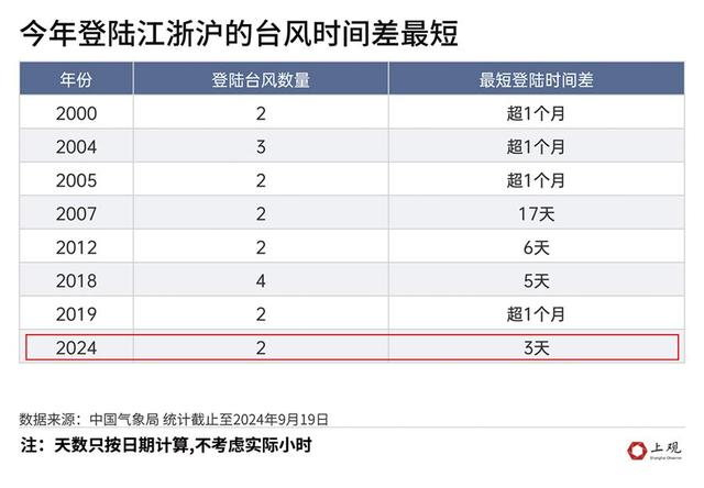 尽管如此,今年短时间内登陆两个台风的情况还是很罕见的。数据显示,在一周以内江浙沪地区有两次台风登陆的年份有3个,分别是2012年、2018年和2024年;而一半的年份台风登陆时间差会在一个月以上。