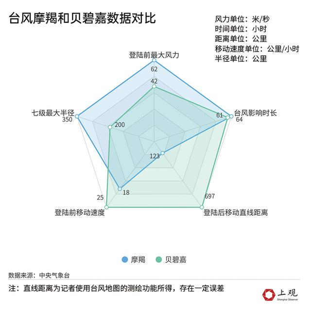 作为1949年以来登陆我国最强的秋台风,摩羯毫无疑问更具破坏力,在数据上体现在“最大风力”和“最大半径”都强于“贝碧嘉”许多。