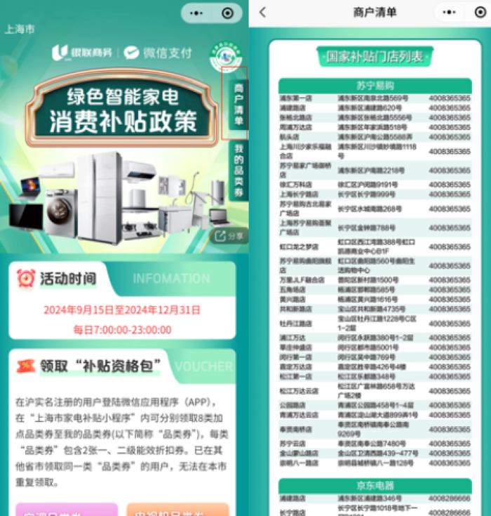 除国家政策补贴外,在沪消费者还可用微信支付立减15%,包含52类家电、家装、家具和适老化产品,单笔订单补贴最高2000。