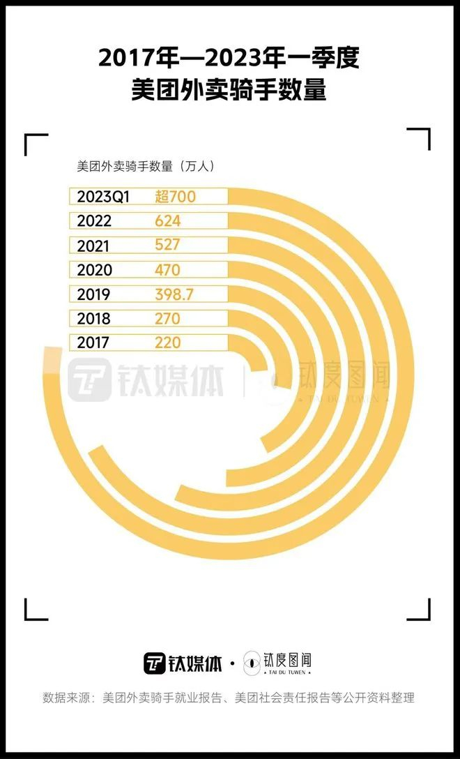 2017-2023年,美团平台有单骑手的数量从220万增加到745万,年均约增加87.5万人。单价也从此前的平均一公里1.2元,到现在一公里不到0.5元。