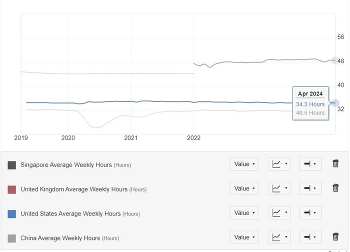 据世界贸易经济数据网站显示,2024年4月份,中国的每周工作时长为48.5小时,相当于一周工作五天,每天9.7个小时;而美国则为34.3小时,相当于相当于一周工作五天,每天6.86个小时。