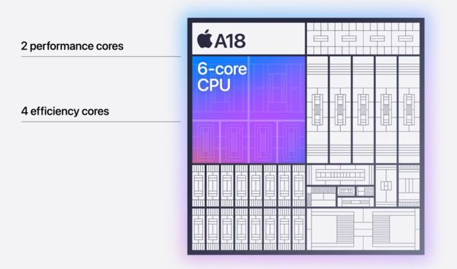 你们看哈,A18 和 A18 Pro 都是 2+4 的六核 CPU 架构,都是台积电的第二代 3nm 工艺,最大的区别在于, A18 的GPU 比 A18 Pro 少了一个核心。