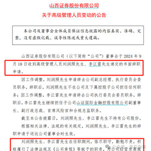 9月18日,山西证券高管密集离任引发市场关注。根据公告,公司副总、执行委员会委员刘润照和公司执行委员会委员李江雷携手辞职。其中,李江雷辞职后依旧担任山证国际副董事长等要职。