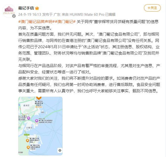 首先在质量问题方面,我们并无问题。其次,“澳门葡记食品有限公司”,即与辉同行销售款品牌,与网传的在香港注册的“澳门葡记食品有限公司”没有任何关系。网传公司已于2024年5月31日申请处于“休止活动”状态,其注册信息、股权结构、业务范围、管理团队、财务状况等均与销售款品牌“澳门葡记食品有限公司”及我司并无关联。