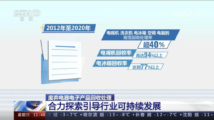 生态环境部发布的《中国电子废物环境综合管理(2012-2021)》显示,从2012年开始,国家通过发放基金等方式,引导电器回收行业发展,时至今日已经取得了一定成效:电视机回收率高达94%以上,电冰箱回收率达到77%以上。