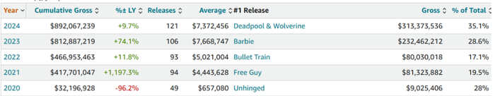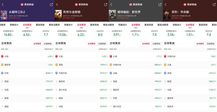 在这个过程中,迪士尼无疑扮演了“救市主”的角色。从单片来看,《头脑特工队2》和《死侍与金刚狼》双双突破6亿大关,并分别改写动画长片和R级电影的历史纪录,两片合力贡献整个暑期档超过1/3的份额,成为驱动影市行情转热的火车头。以皮克斯和漫威影业为代表,迪士尼包揽年度卖座榜前两席,助推制片业务迎来快速反弹,逐渐摆脱去年多片亏损的阴霾。与此同时,归于迪士尼旗下的20世纪影业也表现亮眼,《猩球崛起:新世界》和《异形:夺命舰》都排进档期前12名,实力不逊于好莱坞五大的其余玩家。以整体视之,迪士尼的发行总票房报收于15亿美元,市场份额更达到42%左右。