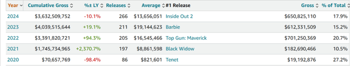 尽管暑期档大盘录得双位数降幅,但考虑到整体低开高走的曲线,最终结果依然优于业界预期。以月度细分来看,5月份,在多片改档或发挥失常后,当月院线总产出仅为5.5亿美元,同比暴跌28.9%。若排除影院歇业或运营受限的例外情况,这是自1998年后最差的暑期档开局,一度为行业的复苏前景蒙上阴影。