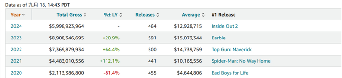不似国内暑期档高开低走,北美恰好反过来——开局不佳,但后半程奋起直追。档期总票房以逾36亿美元收官,同比跌幅一成左右。