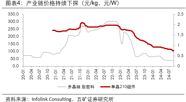 24Q2产业链价格继续下行,报表端业绩已经出现明显负面影响,目前产业链价格逐步企稳,虽然不排除有进一步下跌的可能性,但是基本达到行业价格底部,报表端业绩或将在24Q4或之后逐步企稳。
