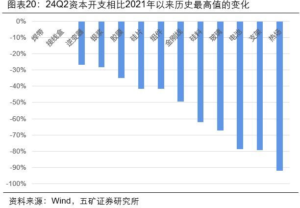 24Q2行业资本开支继续环比降低,其中,热场、支架、电池等环节资本开支相比历史高点降幅达到8~9成,上述环节在未来可能率先迎来行业供需逆转。