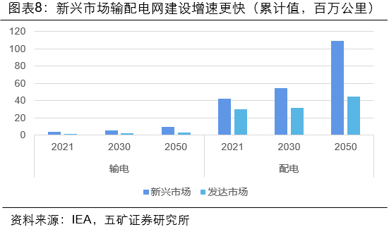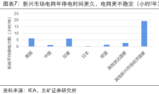 1.新兴市场电力需求持续上升,但电网常出现停电现象,长期解决方案是加大输配电投资,新兴市场输配电建设增长更快;短期则可以通过光储系统实现用电侧电力需求匹配。