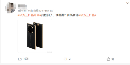 9月20日10:08,华为新款三折叠手机HUAWEI Mate XT非凡大师开售,同一用户仅限购买一台。开始抢购后,Mate XT 非凡大师全部型号迅速售罄。目前官网渠道已无货。据华为商城,9月21日10:08将再次放货。