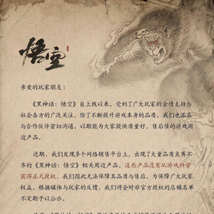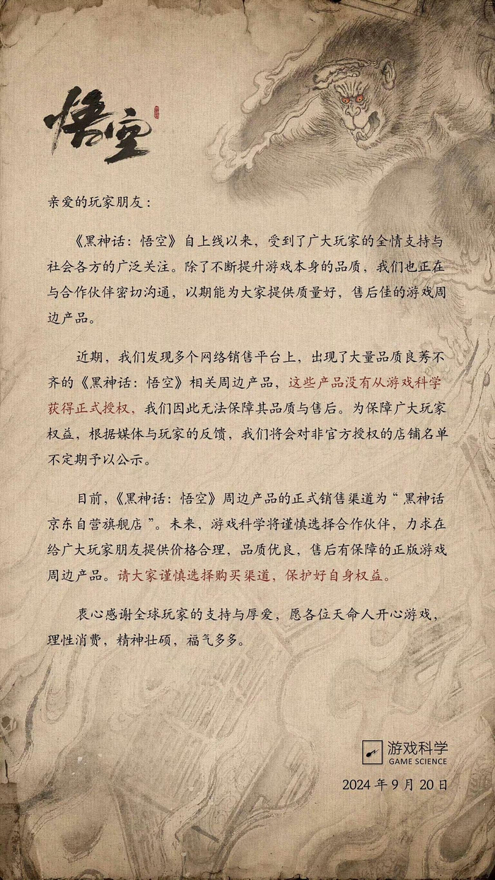 9月20日,《黑神话:悟空》官方微博发表关于周边产品的声明称,近期,发现多个网络销售平台上出现了大量品质良莠不齐的周边产品,这些产品没有从“游戏科学”获得正式授权,无法保障品质和售后。为保障玩家权益,将不定期公示非官方授权的店铺名单。同时,公司表示未来将谨慎选择合作伙伴,力求为玩家提供价格合理、品质优良、售后有保障的正版游戏周边产品。同时呼吁天命人“理性消费”。