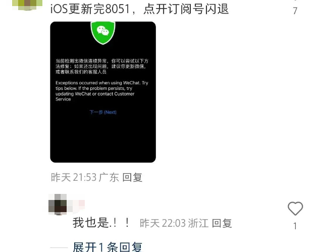 小红书上,也有用户称在iPhone上将微信更新为新版本8.0.51后,点开微信订阅号就出现闪退,重启后并未解决问题。多名用户在评论中反映,自己使用的也是iPhone,也出现了类似问题。