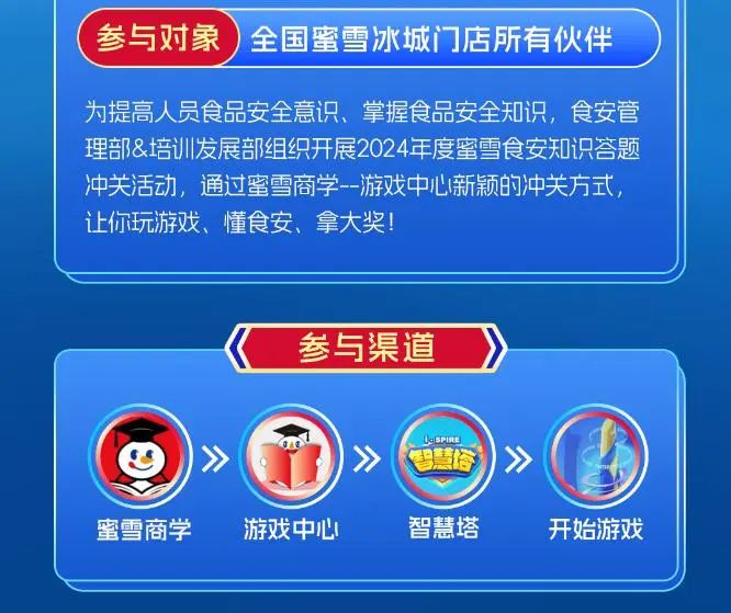 蜜雪冰城拥有属于自己的“科目一”,通过趣味智慧塔挑战和全国排位赛,让奋斗青年在轻松快乐的氛围中快速、便捷掌握食品安全法律法规、门店食品安全操作标准、食品安全管理等方面的知识,确保每位门店员工都能成为食品安全的守护者。