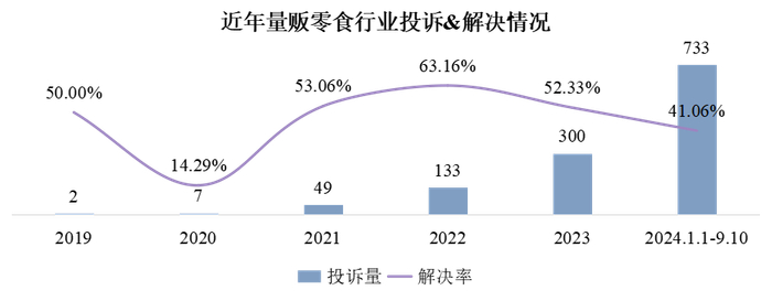 自2019年以来,中国电子商会旗下的消费服务保障平台消费保共收到1,224件关于量贩零食行业的投诉。从数据趋势来看,量贩零食行业的相关投诉量自2019年起明显上升,2023年的投诉量达到300件,同比增长125.56%,涉诉金额超过7万元;截至2024年9月10日,累计投诉量已达733件。