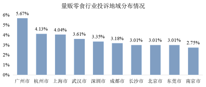 同时,投诉用户的主要聚集地区排名前十分别为广州市(5.67%)、杭州市(4.13%)、上海市(4.04%)、武汉市(3.61%)、深圳市(3.35%)、成都市(3.18%)、长沙市(3.01%)、北京市(3.01%)、东莞市(3.01%)和南京市(2.75%)。