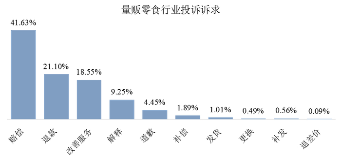 在消费保平台上,量贩零食行业相关的消费者诉求主要集中在赔偿、退款、服务改善、解释及道歉等方面。其中,要求赔偿的投诉最多,高达927件,占比41.63%;要求退款的投诉紧随其后,共470件,占比21.1%;要求改善服务的投诉排名第三,达413件,占比18.55%。