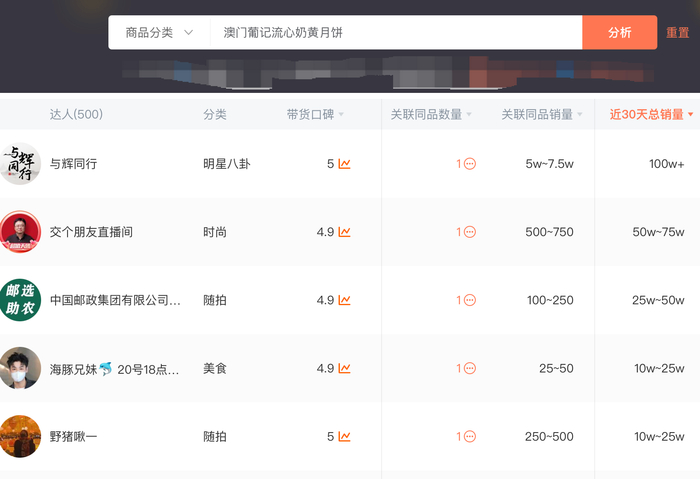 另据蝉妈妈数据显示,抖音平台上,澳门葡记流心奶黄月饼商品关联达人销量排名前三位分别是与辉同行、交个朋友直播间、中国邮政集团有限公司,近30天总销量分别为超100万、50万至75万、25万至50万。