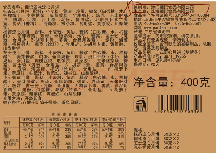 记者搜索葡记月饼,京东平台显示400g包装售价219元。该商品包装显示,月饼监制商为澳门葡记商品有限公司,生产商为珠海葡记食品有限公司。淘宝平台上的葡记月饼包装相似,同样的400g售价75.9元。生产商信息仅显示厂名为珠海葡记食品有限公司。记者向客服询问商品是否由澳门葡记商品有限公司担任监制商,客服回复称商品就是葡记的品牌,珠海葡记食品有限公司“应该是分工厂吧”。