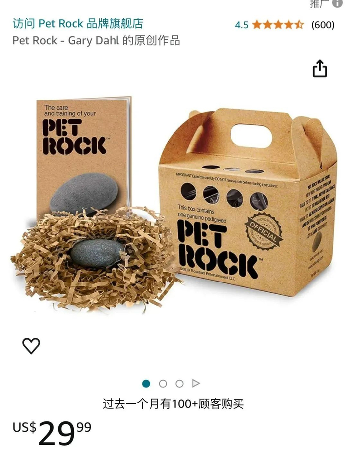 亚马逊上,有款名为“宠物石”的单品,售价29.9美元(约合人民币211元)。它跟路边撞见的普通鹅卵石一样,但又不一样。它长约5厘米,有塑料眼睛,被安放在一堆人工稻草里,背后还附赠着“养育手册”。年轻人乐此不疲地买石头,并将其做为宠物养育着。