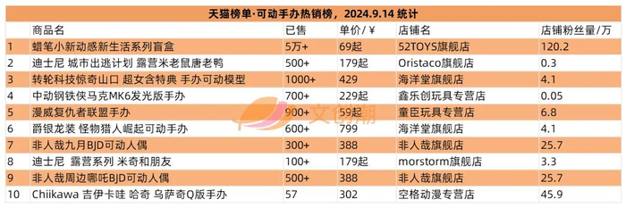 以蜡笔小新为例,文创潮统计显示,52TOYS的蜡笔小新动感新生活系列,近一年来长期位于天猫可动手办热销榜榜首;灵动创想凭借蜡笔小新新次元系列搪胶大娃,进入过天猫抖音等平台畅销榜前列……