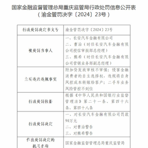国家金融监督管理总局重庆监管局对长安汽车金融有限公司罚款90万元,并对时任长安汽车金融有限公司授信审批部总经理曹治、时任长安汽车金融有限公司营销业务部副总经理熊希予以警告。