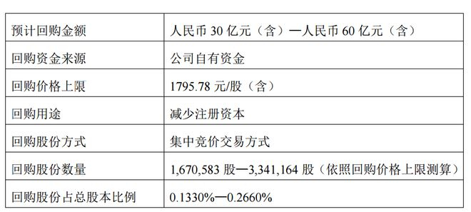 从回购股份价格来看,贵州茅台计划不超过1795.78元/股(含)(不高于公司董事会通过回购股份决议前30个交易日公司股票交易均价的130%)。