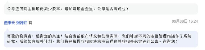 9月9日,贵州茅台董事长张德芹在2024年半年度业绩说明会上称:“结合当前股市和公司实际情况,我们针对不同的市值管理措施做了系统研究,后续如有相关计划,我们将严格履行相应决策审议程序并按相关规定进行公告。”