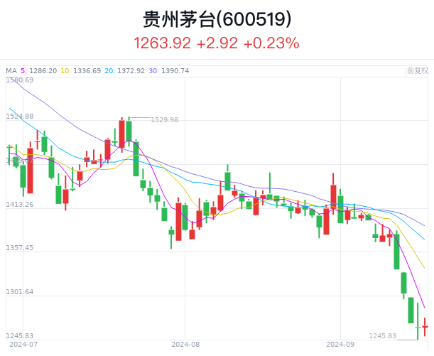 截至9月20日收盘,贵州茅台的股价为1263.92元/股,总市值为1.59万亿元。