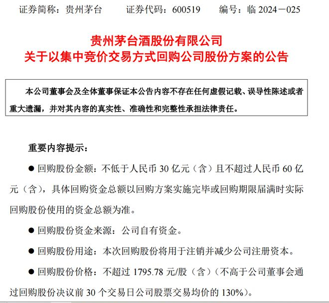 9月20日晚间,贵州茅台公告称,公司拟以30亿元至60亿元回购股份,用于注销并减少注册资本,回购股份价格不超过1795.78元/股(含)。