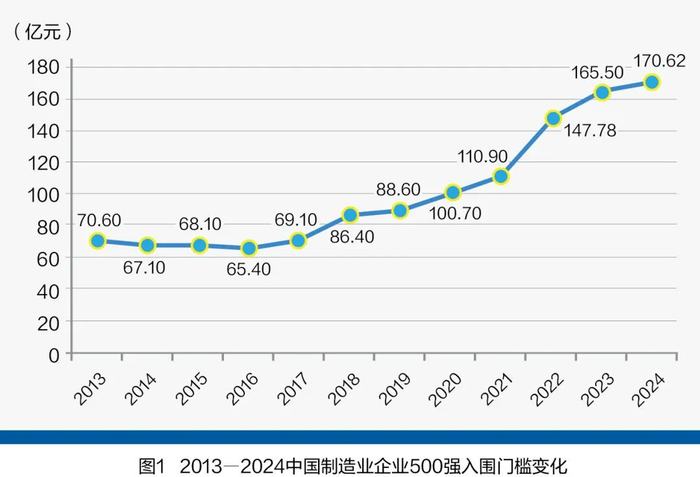 2024中国制造业企业500强总体营业收入规模仍保持增长态势,但增速较上年明显下滑。入围门槛继续走高,突破170亿元,如图1所示。